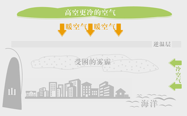 论气象条件对PM2.5浓度变化的影响,逆温起到关键作用,这点在秋冬季尤为明显。什么是逆温?通常情况下,气温随着海拔升高而降低,下层空气较热,上层空气较冷,冷空气重会下沉,热空气轻会上浮,就形成了对流。但在某些时候,比如秋冬季夜间,因为地面温度急剧降低,导致贴近地面的下层大气温度很低,上层空气降温没那么快,反而温度比下层高,发生“气温的逆转”现象。这种下冷上热的逆温层结一旦形成,空气无法上下对流,污染物就很难扩散。
